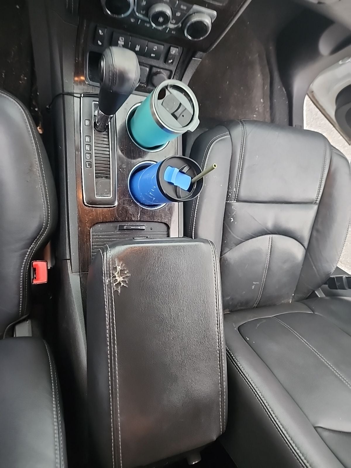 - Console, front center with 2 cup holders, covered storage bin and sliding armrest with storage